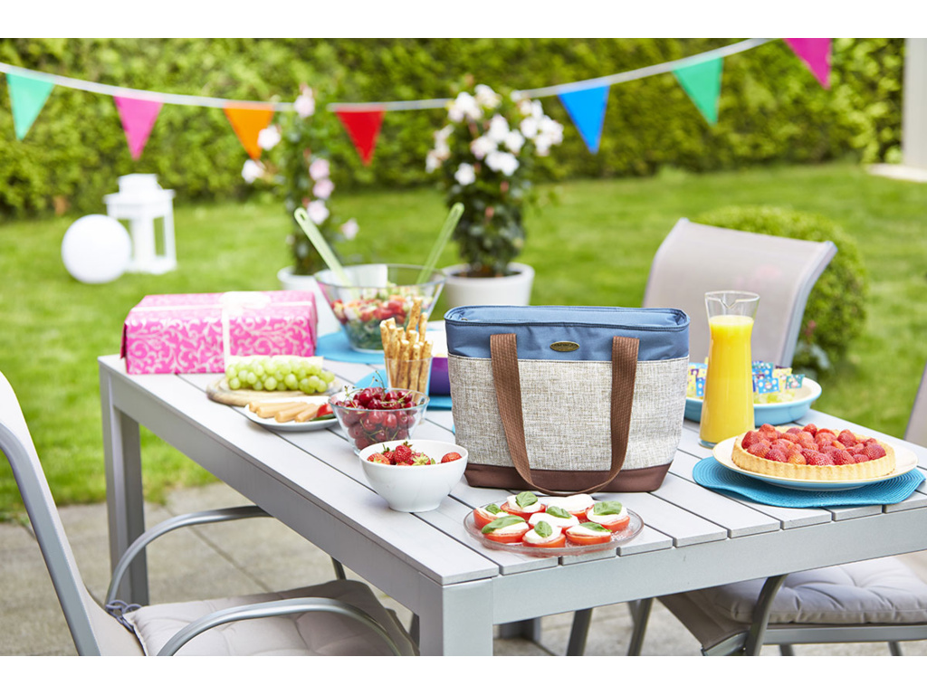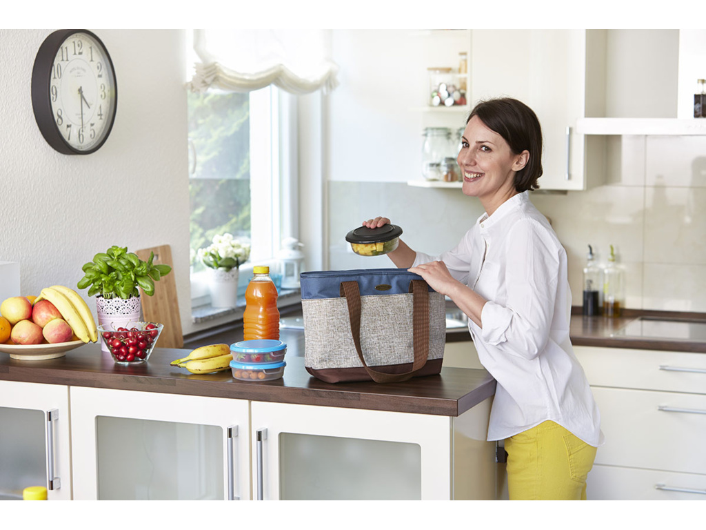 Na rozdiel od krabíc sa chladiace tašky s atraktívnym dizajnom ľahko balia a pohodlne sa prenášajú buď cez rameno, alebo v ruke. Chladiaci účinok je s chladiacimi vložkami až 11 hodín. Vďaka polyetylénovej izolácii nehrozí riziko úniku kvapalín alebo vzniku plesní. Všetky chladiace tašky sú vhodné na rodinné pikniky v prírode a na pláži. Kapacita: 12 lMôže pojať: 9 x 0,5 l fliašRozmery: 41 x 17 x 26 cmDoba chladenia: 19 h s chladiacimi vložkami Freez'Pack® (nie sú súčasťou balenia)