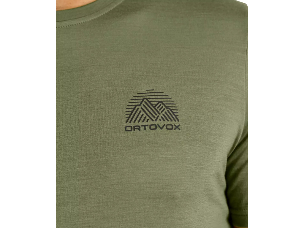 Stylový potisk loga ORTOVOX s horskou tématikou.