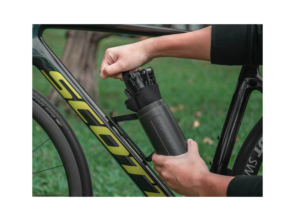 Šikovný kontajner na náradie v podobe cyklofľaše s možnosťou prepravy v klasickom košíku na cyklofľaše. Dokáže pojať Multiklíč, CO2 hustilku, montpáky, náhradnú dušu a mini hustilku, prípadne iné potrebné vybavenie pre náročnejšiu cyklistiku.