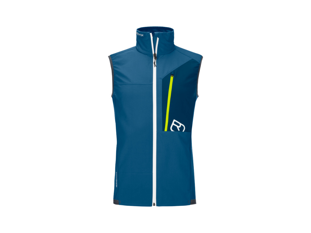 Vesta atletického střihu s elastickým lemem, která byla vyvinuta speciálně pro potřeby skitouringu? To je model ORTOVOX Berrino s náprsní kapsou, dvouvrstvým límcem a rychleschnoucími vlastnostmi.