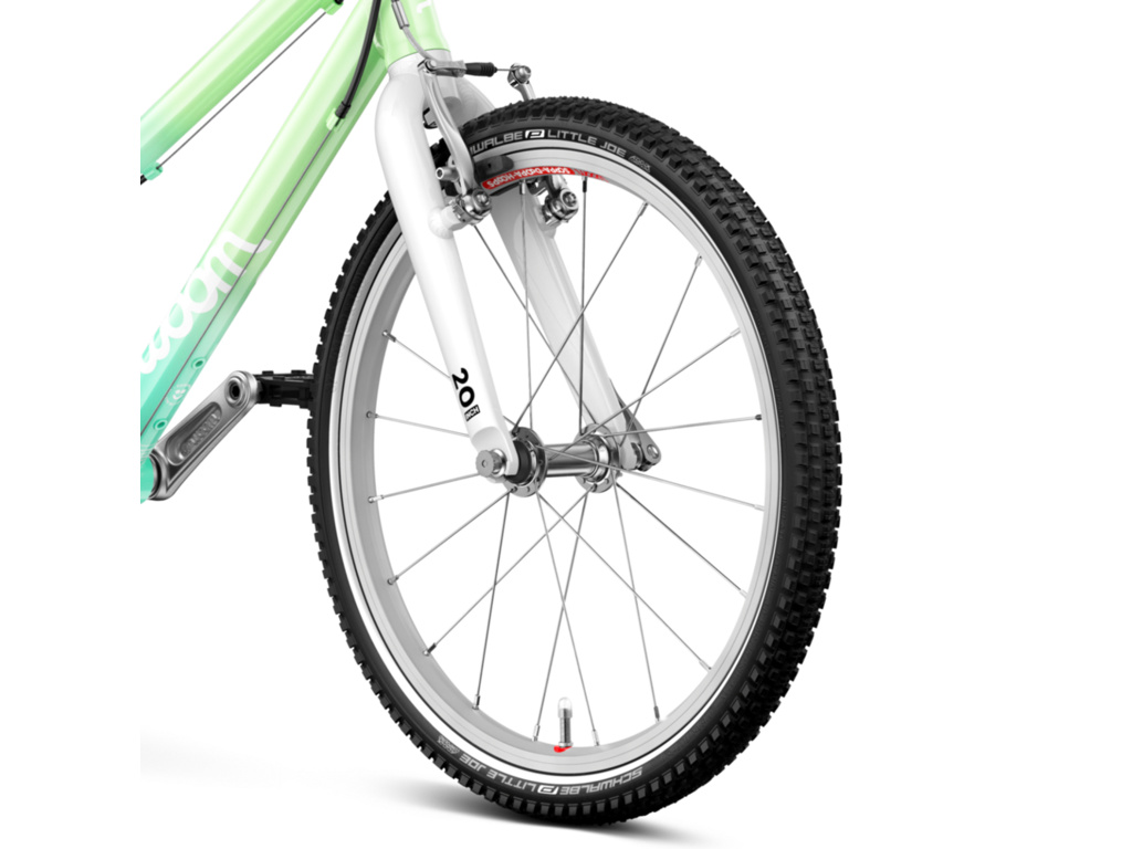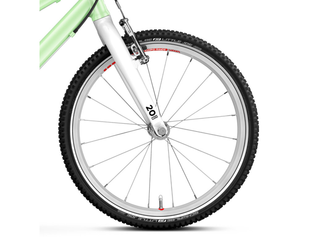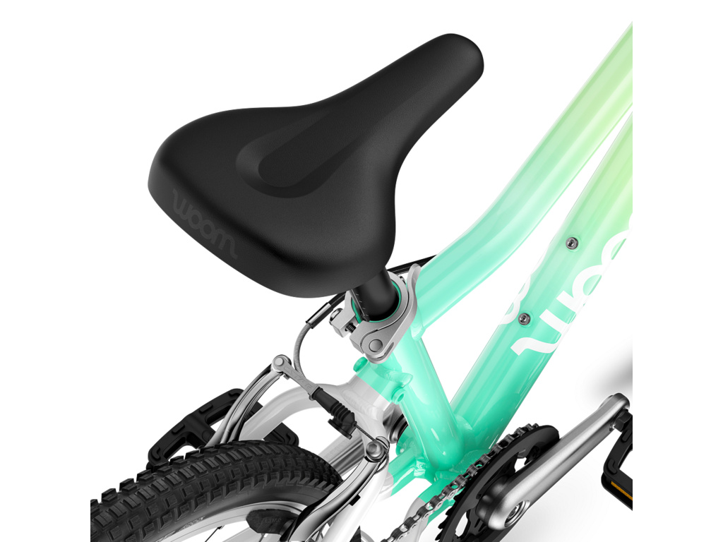 20-palcový detský bicykel Woom GO 4 váži len 7,8 kg a jeho špeciálna detská geometria zabezpečuje prirodzene vzpriamenú polohu jazdca a jednoduché ovládanie. Otočné radenie so symbolom zajaca a korytnačky uľahčí deťom zmenu rýchlostí a prehadzovačka MicroShift so 7 prevodmi umožní zvládnuť jazdu v každom teréne.