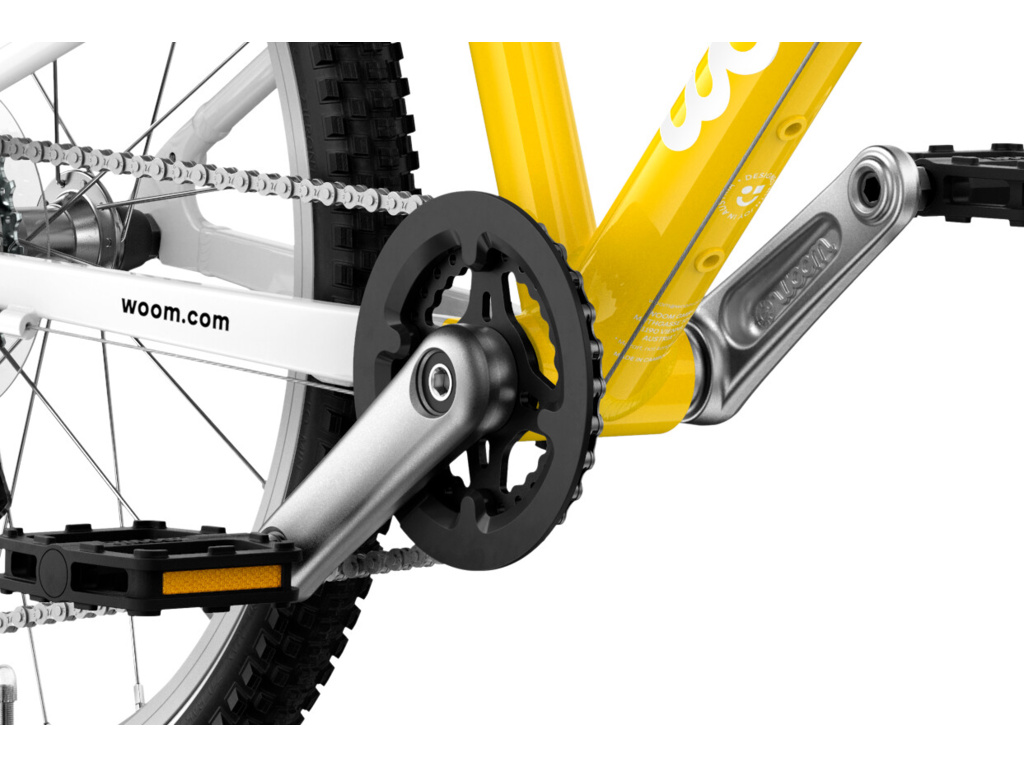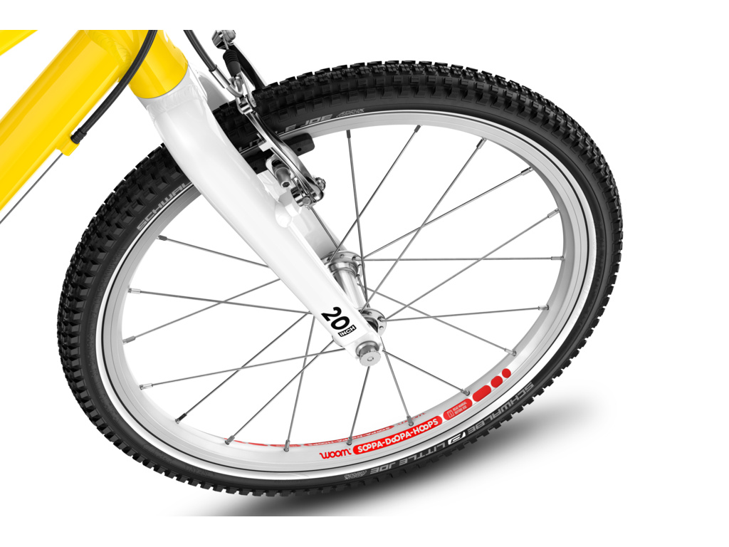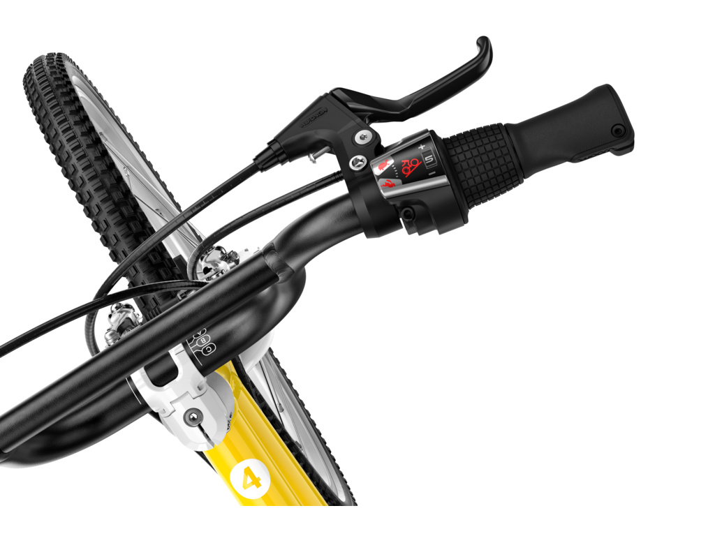 20-palcový detský bicykel Woom GO 4 váži len 7,8 kg a jeho špeciálna detská geometria zabezpečuje prirodzene vzpriamenú polohu jazdca a jednoduché ovládanie. Otočné radenie so symbolom zajaca a korytnačky uľahčí deťom zmenu rýchlostí a prehadzovačka MicroShift so 7 prevodmi umožní zvládnuť jazdu v každom teréne.