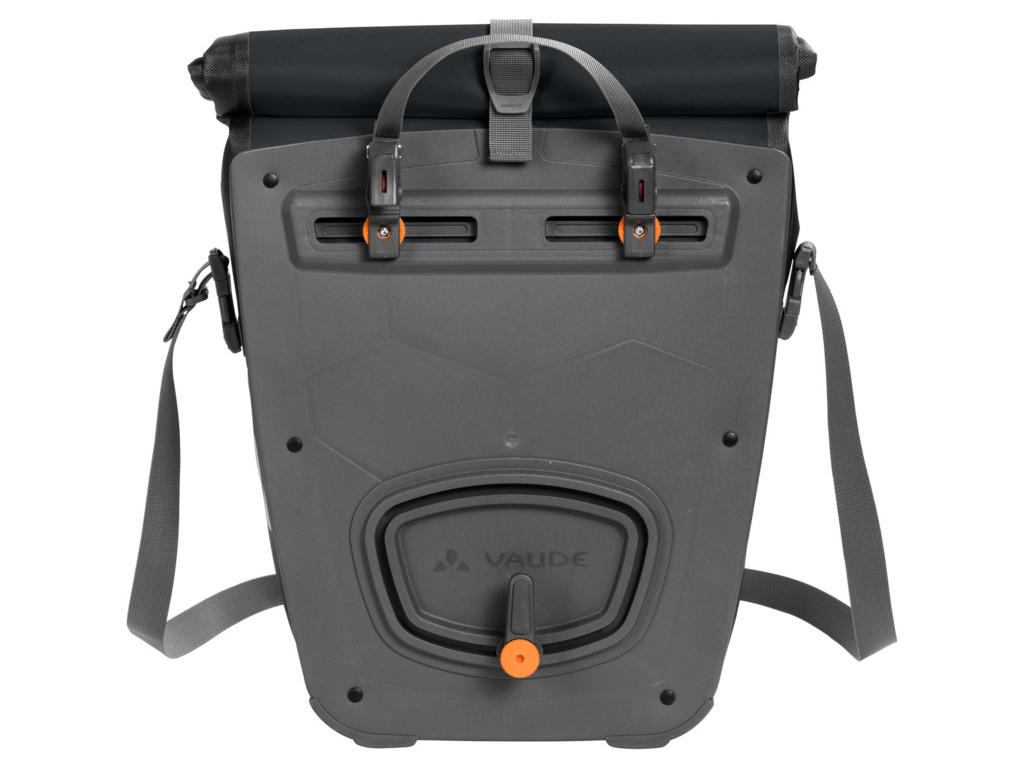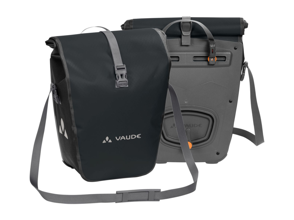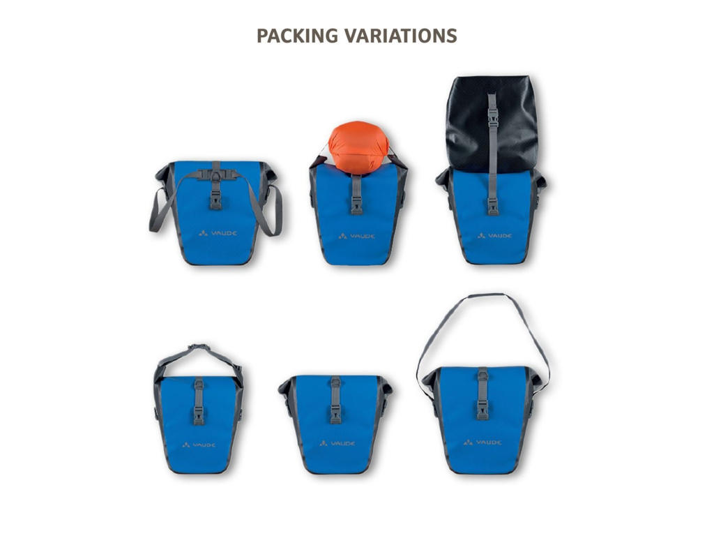 Priestranné a vodotesné batohy Vaude Aqua Back Bike Panniers sa pripínajú na zadnú časť bicykla pomocou rolovacieho uzatváracieho systému, ktorý umožňuje prispôsobiť hlavný priestor obsahu a zabezpečiť jeho vodotesnosť. Sada dvoch batožinových priest