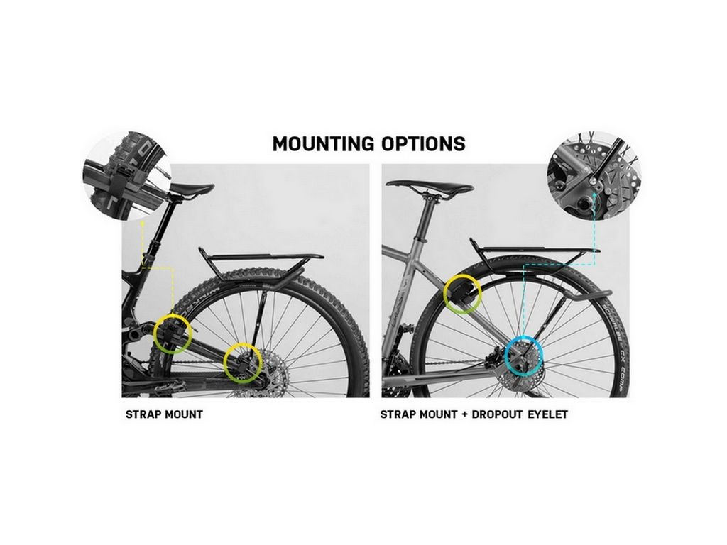 Vylepšený rýchloupínací zadný nosič najnovšej generácie s vyššou nosnosťou o 66%, určený uchytenie na zadnú stavbu rámu celoodpružených MTB, e-bikov alebo hardtailových bicyklov, ktoré nemajú na zadnej stavbe rámu montážne otvory na klasický nosič.