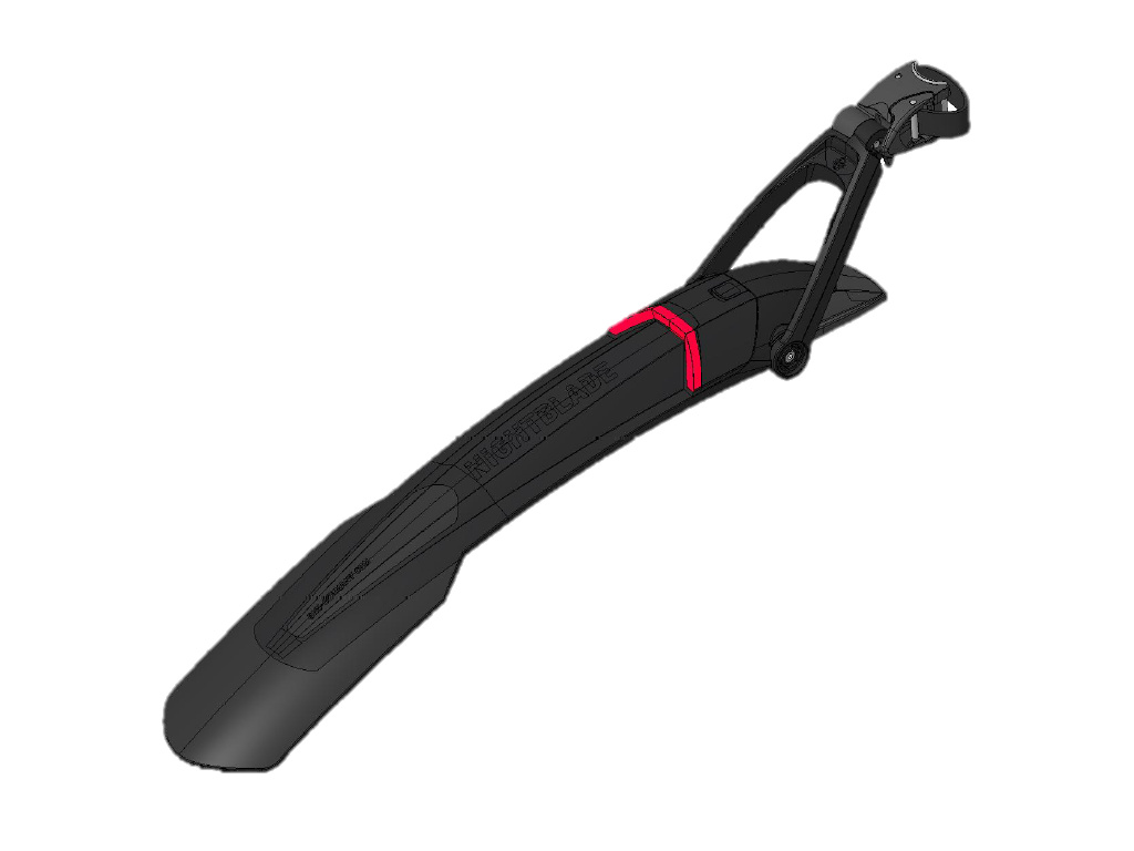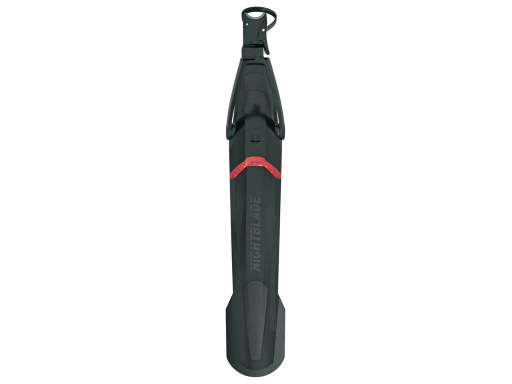 Blatník Nightblade je moderné riešenie pre horské bicykle, ktoré kombinuje optimálnu ochranu proti striekajúcej vode s vyššou bezpečnosťou vďaka integrovanému zadnému svetlu. Toto svetlo, vybavené dobíjacou batériou, je možné ľahko ho vybrať a nabiť cez USB. Blatník je navrhnutý s jednoduchým upínacím systémom, ktorý umožňuje jeho montáž na väčšinu sedloviek, a vďaka dvom kĺbom ho možno perfektne prispôsobiť akémukoľvek bicyklu. Je vhodný pre kolesá veľkosti 26" až 27,5"+, s maximálnou šírkou plášťa 3,0" a šírkou 52–75 mm. Dĺžka blatníka činí 620 mm.