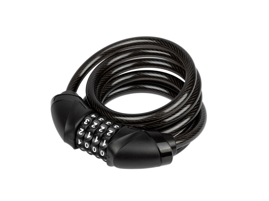 Spoľahlivý a odolný špirálový zámok na štvormiestny kód s priemerom lanka 12 mm. Mäkký plast na povrchu chráni lak bicykla pred poškodením. S dĺžkou 1800 mm je model použiteľný na uzamknutie aj viac bicyklov dohromady.