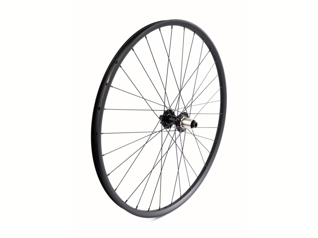 Zadní zapletené kolo 29" s Boostovým nábojem a ráfkem s vnitřní šířkou 25 mm.